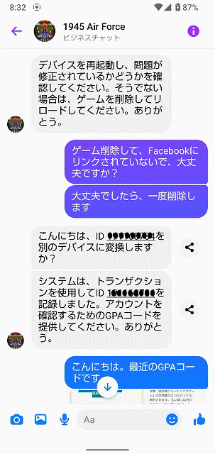 この方法は裏技的な救済方法ですので、事前にFacebookかgoogle IDに「1945 air force 」IDを紐づけしておくことをお勧めいたします。